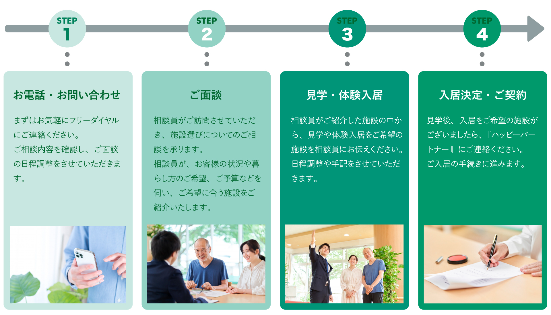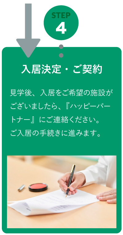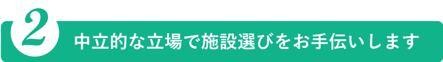 『ハッピーパートナー』では、老人ホーム・介護施設に関して、豊富な知識を持った相談員が相談を承ります。入居されてから、後悔されることのないよう、見学はもちろん、体験入居の手配や事前に知っておくべきことなどもお伝えします。老人ホームや介護施設のパンフレットや見学時の案内は、施設の良い部分を強調したものがほとんどです、『ハッピーパートナー』は、施設を運営しておりませんので、中立的な立場から、お客様にご満足いただける施設をご紹介いたします。